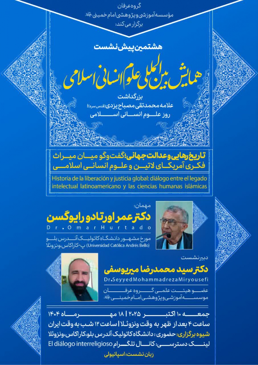 گروه عرفان مؤسسه آموزشی و پژوهشی امام خمینی ره برگزار میکند: هشتمین پیشنشست همایش بینالمللی علوم انسانی اسلامی روز بزرگداشت علامه محمدتقی مصباح یزدی (قدس سره) | روز علوم انسانی اسلامی عنوان «تاریخ رهایی و عدالت جهانی؛ گفتوگو میان میراث فکری آمریکای لاتین و علوم انسانی اسلامی» Historia de la liberacion y justicia global: dialogo entre el legado intelectual latinoamericano y las ciencias humanas islamicas سخنران