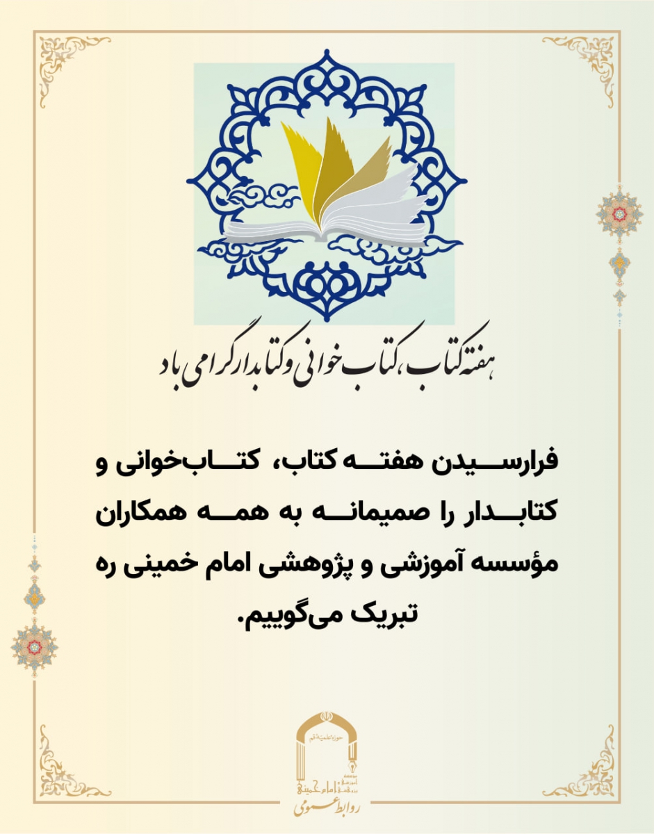 فرارسیدن هفته کتاب، کتاب‌خوانی و کتابدار را صمیمانه به همه همکاران گرامی مؤسسه آموزشی و پژوهشی امام خمینی ره تبریک می‌گوییم.
