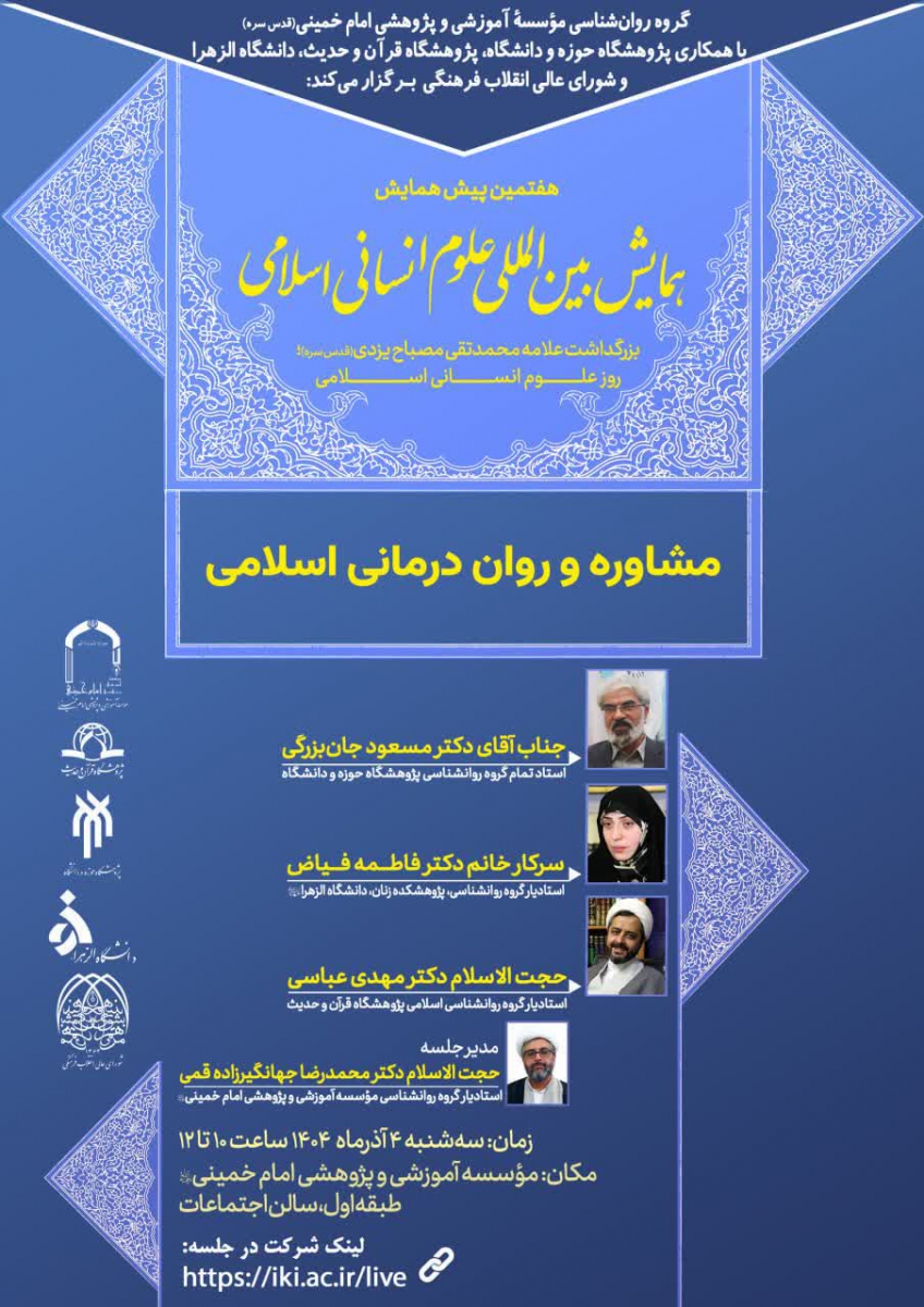 گروه روانشناسی مؤسسه آموزشی و پژوهشی امام خمینی(ره) باهمکاری پژوهشگاه حوزه و دانشگاه، پژوهشگاه قرآن و حدیث، دانشگاه الزهرا و شورای عالی انقلاب فرهنگی برگزار میکنند. هفتمین پیشهمایش همایش بینالمللی علوم انسانی اسلامی | روز بزرگداشت علامه محمدتقی مصباح یزدی (قدس سره) | روز علوم انسانی اسلامی میزگردی علمی با موضوع | «مشاوره و روان درمانی اسلامی»
