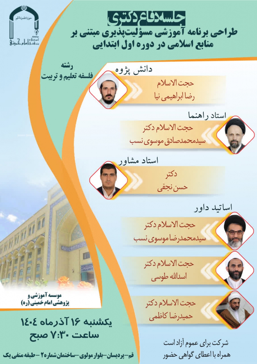 مکان: قم، پرديسان - بلوار مولوی - ساختمان شماره ۲ مؤسسه آموزشی و پژوهشی امام خمينی (ره) - طبقه منفی یک، سالن جلسات دفاع