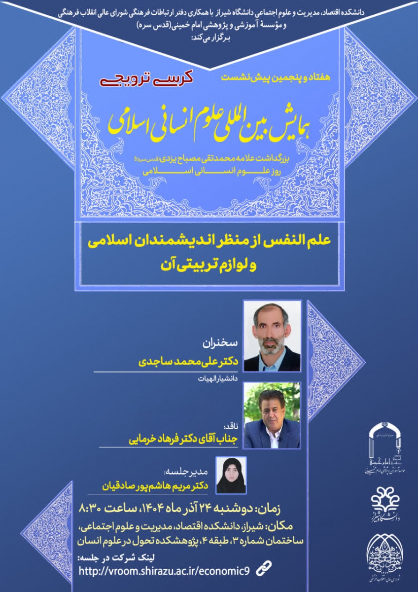 دانشکده اقتصاد، مدیریت و علوم اجتماعی دانشگاه شیراز با همکاری دفتر ارتباطات فرهنگی شورای عالی انقلاب فرهنگی و مؤسسه آموزشی و پژوهشی امام خمینی(ره) برگزار میکنند: